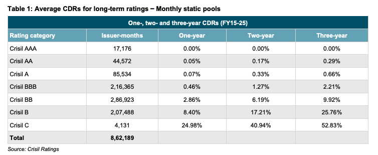 That said, if you want a practical sense of what ratings have meant historically in terms of realised defaults, default studies are a useful reference point. For example, the CRISIL default data (FY15–FY25 monthly static pools) shows that 3-year cumulative default rates rise sharply as you move down the rating ladder—approximately AAA: 0.00%, AA: 0.29%, A: 0.66%, BBB: 2.21%, then stepping up meaningfully in lower ratings (BB: 9.92%, B: 25.76%, C: 52.83%). In simple terms: higher ratings have historically translated into materially lower default incidence over a 3-year window, while lower-rated credit carries a meaningfully higher chance of default.