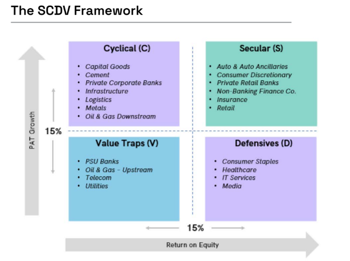 - Cyclical: High earnings growth (>15%) with lower ROEs (<15%).