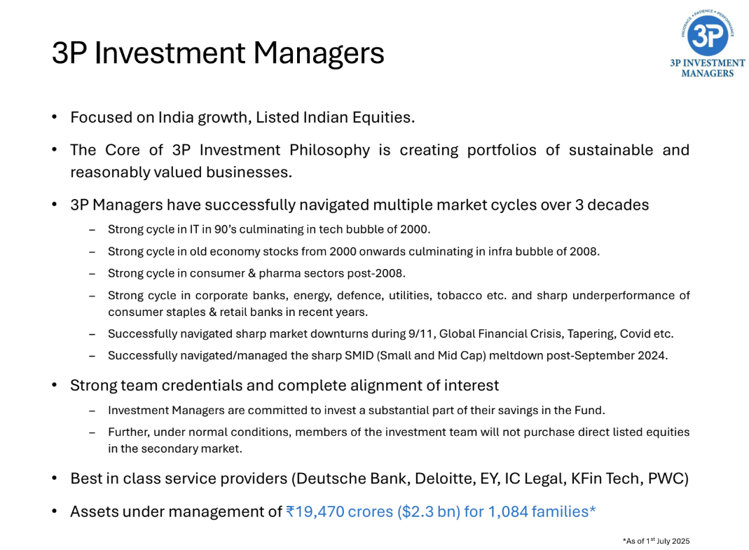 Although 3P is a relatively new asset manager, it is backed by strong investment team and is owner-fund manager managed. First, their investment team boasts significant pedigree, with industry veterans like Prashant Jain (former CIO of HDFC Mutual Fund) and Ashwani Kumar (former Fund Manager at Nippon). Together, they bring over six decades of experience to the table. Second, 3P is an owner-based AMC, which we actively endorse for its higher stability in both the investment team and its philosophy.