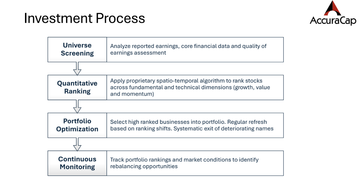 AccuraCap’s proprietary ranking algorithm conducts extensive spatio-temporal analysis of businesses, comparing each company across peers over time. This process helps narrow the investment universe to a subset of high-quality businesses. The algorithm then applies the “Pendulum Hypothesis,” investing in these businesses when valuations are reasonable. The portfolio follows an equal-weighted construction approach, allowing the system to systematically retain winning positions and eliminate underperformers at regular intervals.