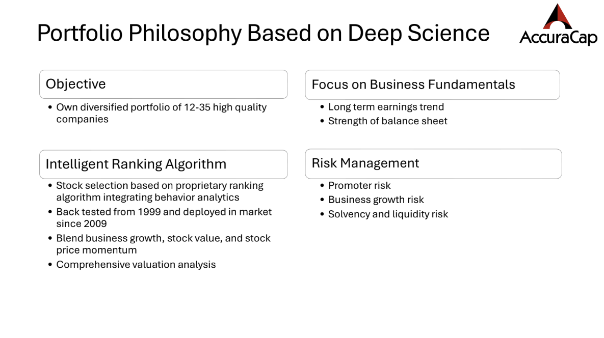 Unlike many quant strategies, AccuraCap’s approach remains fundamentally oriented, while also exploiting market psychology. The strategy is risk-averse and conservative, with no arbitrary sector or stock weightings, enabling disciplined and emotion-free decision-making.