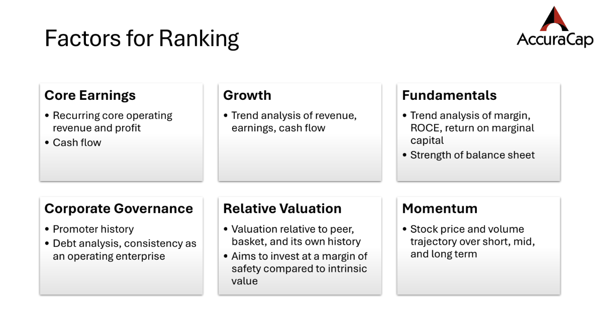 Accuracap PMS’s Alpha 10 strategy is a quant-strategy that seeks to construct a portfolio of 12-35 high-quality companies (large-cap focused) based on their Artificial Intelligence based Intelligent Ranking Algorithm. The algorithm is based on fundamental factors & risk management, with the portfolio being rebalanced once a year and stocks exited if they fall below the cut-off ranking on the Intelligent Ranking Algorithm. The average historical holding period of stocks is ~2 years.