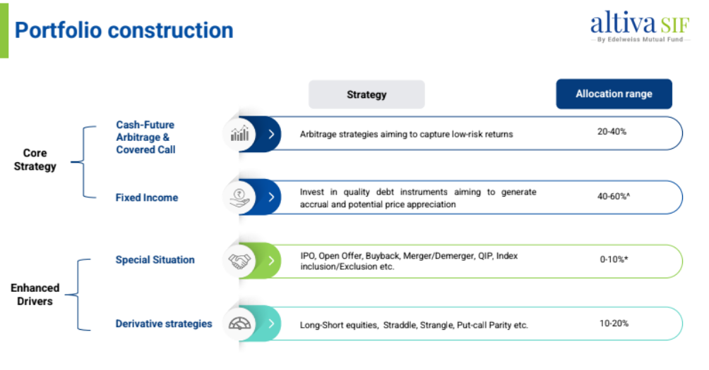 - **Tax-efficient fixed-income fund:** Altiva Hybrid Long Short falls under the a fixed-income-plus category, aiming to generate tax-efficient fixed-income returns. The majority of the strategy (80%+ allocation) is invested in a combination of fixed income & arbitrage opportunities (similar to the fixed-income + arbitrage MF strategies), with the ability to boost returns using limited exposure to higher risk-return special situation (max 10% exposure) & derivative-based strategies (max 10% exposure). - **Decent Alternative to Arbitrage:** The strategy is a decent alternative for Arbitrage funds - seeking to boost returns over Arbitrage by taking some limited levels of incremental risks (limited to 20% of portfolio). While our preferred approach is to wait for SIFs to mature to see the strategy and performance to stabalise over time, we believe that investors can still consider this fund in the context of (a) complex derivative based strategies limited to only 20% of portfolio (b) potential ability of the AMC to leverage some of the strong pedigree of the larger Edelweiss group in this category.