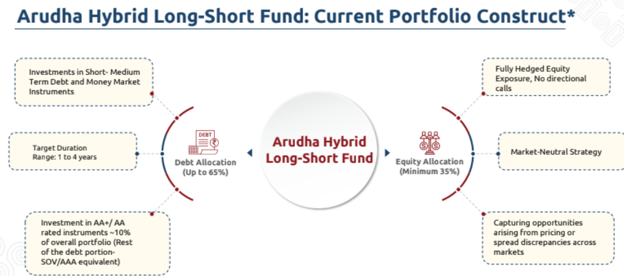 Arudha Hybrid Long Short functions primarily as a fixed income + arbitrage strategy, with no directional equity exposure. - **Equity Exposure** (35-65%): maintained through fully hedged equity positions (arbitrage/derivative) - **Debt Allocation (at most 65%)**: Primary allocation to short- to medium-term debt and money market instruments (1-4 years target duration) - Portfolio is predominantly invested in sovereign and AAA-rated securities - Limited exposure of up to ~10% to AA+/AA credits to enhance portfolio yields.