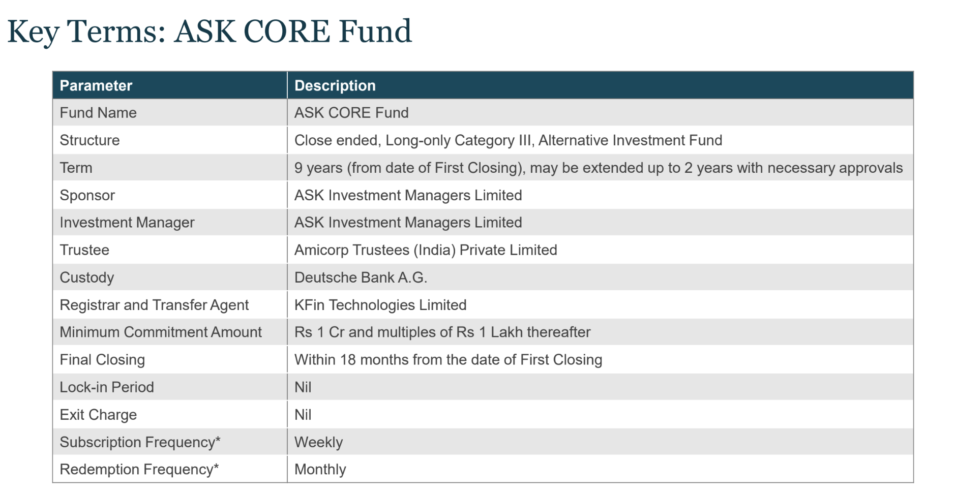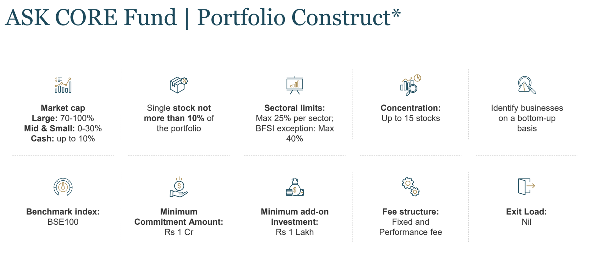ASK Core AIF is the mirror of the ASK Core PMS strategy, which is a high-conviction, large-cap-biased strategy, typically holding a concentrated portfolio of around 15 stocks with at least 70% allocation to large caps. It follows the FOCUS (Fundamentals, Opportunity Size & Scale, Cycles & Capital Allocation, Unmatched Moats, Safety) Investment Philosophy.