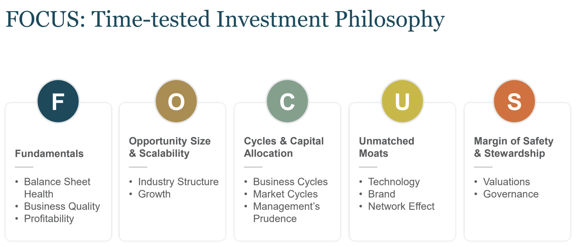The investment philosophy is anchored in a FOCUS-driven framework designed to identify high-quality businesses capable of generating sustainable long-term wealth across market cycles. The approach combines fundamental analysis, assessment of structural growth opportunities, cycle awareness, competitive strength, and valuation discipline to deliver consistent, risk-adjusted outcomes while protecting capital.