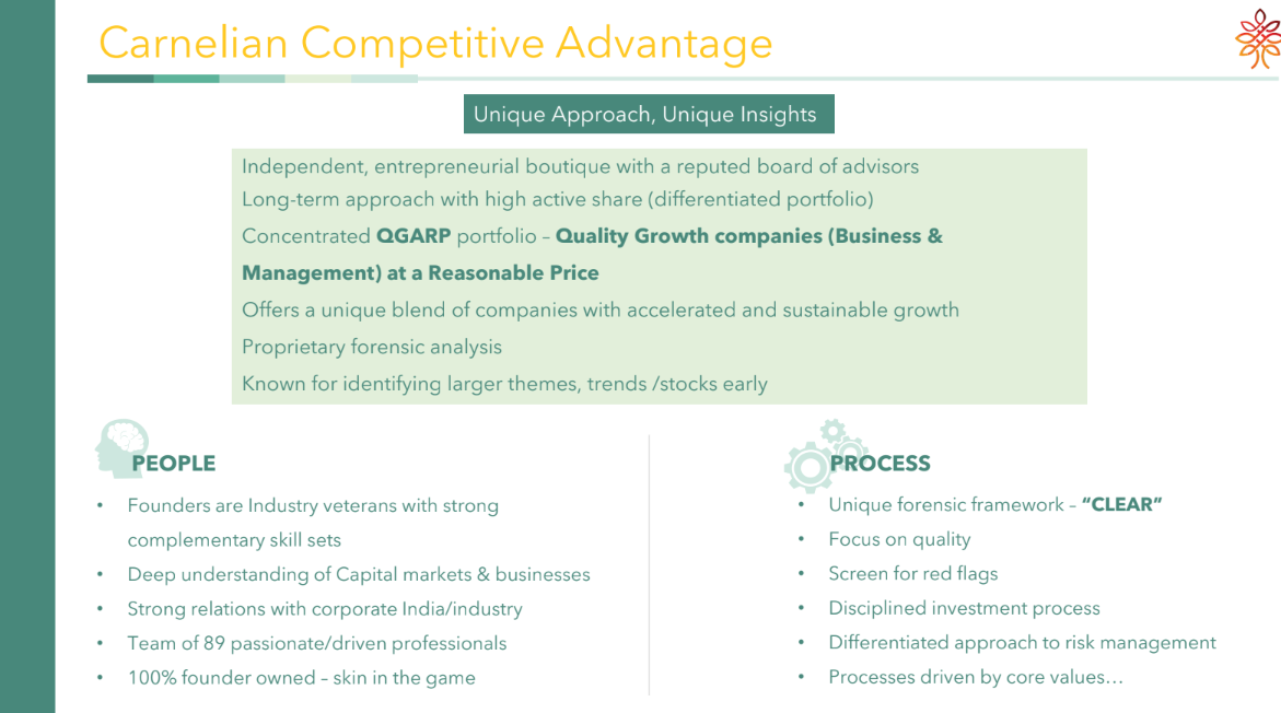 Carnelian is a young firm in the Indian alternatives space with an impressive founding team from ex-senior investment team members of Edelweiss Securities. Vikas Khemani, the ex-CEO, and Manoj, the head of research, have strong research and investment business-building pedigrees. The investment philosophy and processes are well defined, combining quality growth investing (QGARP) with deep forensic diligence and thematic insights. Performance has been strong.