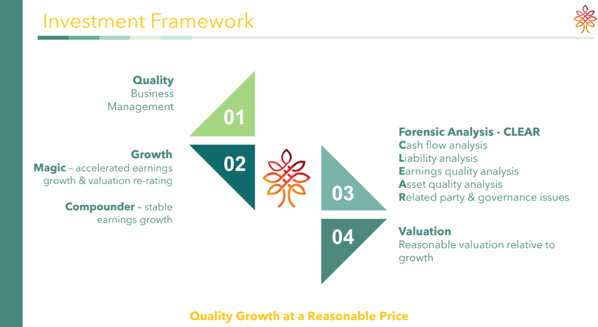 Carnelian’s investment philosophy is its QGARP (Quality Growth at Reasonable Price) approach. The framework seeks to identify high-quality businesses with strong cash flows, clean governance, and sustainable moats, while ensuring valuations are reasonable relative to growth prospects. Their research process integrates thematic foresight, bottom-up stock picking, and a proprietary forensic filter called CLEAR—used to evaluate cash flows, liabilities, earnings quality, and corporate governance. Growth is captured through two lenses: “Magic” stocks that are entering accelerated earnings phases due to inflection points like capex completion or leadership change, and “Compounders” that deliver stable, long-duration returns.