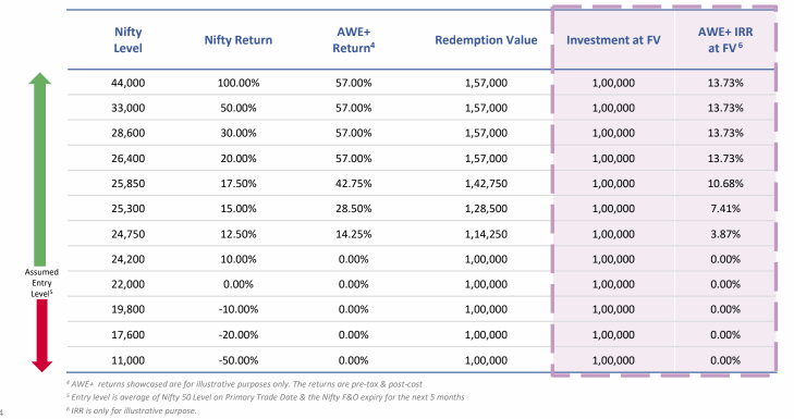 Edelweiss All Weather Equity+ is designed to give returns that are higher than that of the Nifty in slowly upward trending markets. The idea is to help investors with high exposures to equity, generate a 13.7% IRR even in weakish markets. The product has the following payoff structure based the 3 year avg Nifty returns - **3yr Nifty returns < 10%**: Principal protection - **3yr Nifty returns in 10-20% band:** 5.7x of (Nifty returns - 10%) - **3yr Nifty returns > 20%:** absolute returns of 57% Effectively the product has stronger returns than the Nifty for 3yr Nifty returns in the 10-57% band. While this is clearly an attractive payoff structure in slowly upward trending markets, investors should recognise the core inherent risk in all MLD products - **Credit risk on the issuer:** the Issuer of the MLD is essentially guaranteeing this payoff structure (any change would be considered a credit-event and the issuer can be taken to bancruptcy court). The core risk accordingly is with regards the credit worthiness of the issuer: our view on Edelcap is given in our AMC view below - **Close ended product:** in case of a sustained market downcycle in the last 6 months of the product, exit Nifty levels are impacted which can lead to lower returns. Unlike open-ended equity funds, there is no ability to simply hold on until markets recover.