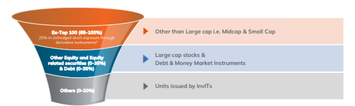 iSIF Equity Ex-Top 100 Long-Short Fund is focused on mid & small-cap equities (Ex-Top 100) aimed at alpha generation, with volatility managed through selective short exposure using derivatives. - **Equity Allocation**: Mid & Small Cap (~65–100% under normal market conditions) | Large-cap & debt: 0–35% for stability and risk management - **Short Exposure**: Ability to take up to 25% unhedged short positions in overvalued stocks within the Ex-Top 100 universe. - **Other Assets**: Flexibility to allocate 0–20% to REITs/InvITs. - **Dynamic Positioning by Market Conditions**: **Positive markets**: Higher allocation to small & mid caps (up to 100%), minimal exposure to Top 100 and Writing Call Options | **Negative markets**: Reduced small & mid-cap exposure (minimum ~65%), increased allocation to Top 100 (up to 35%) with higher Call Options